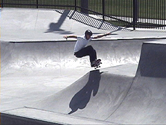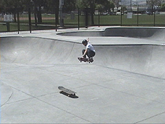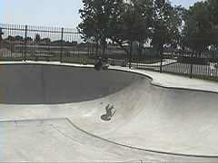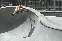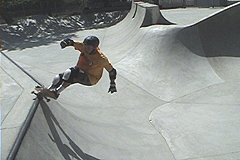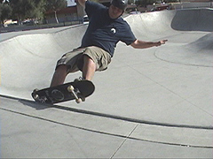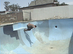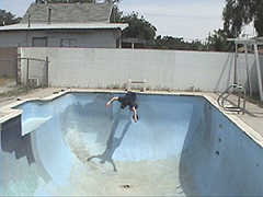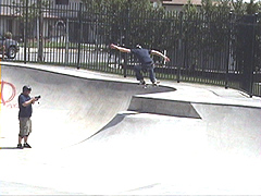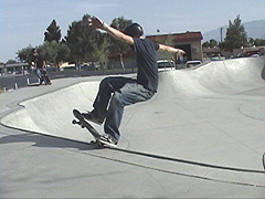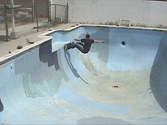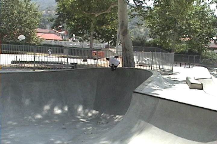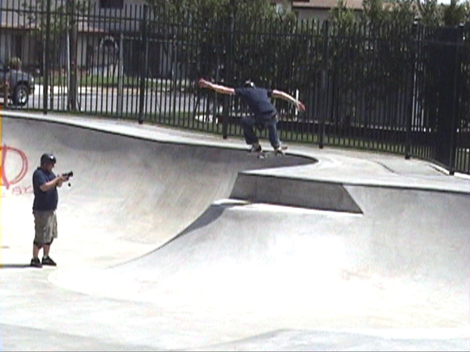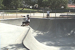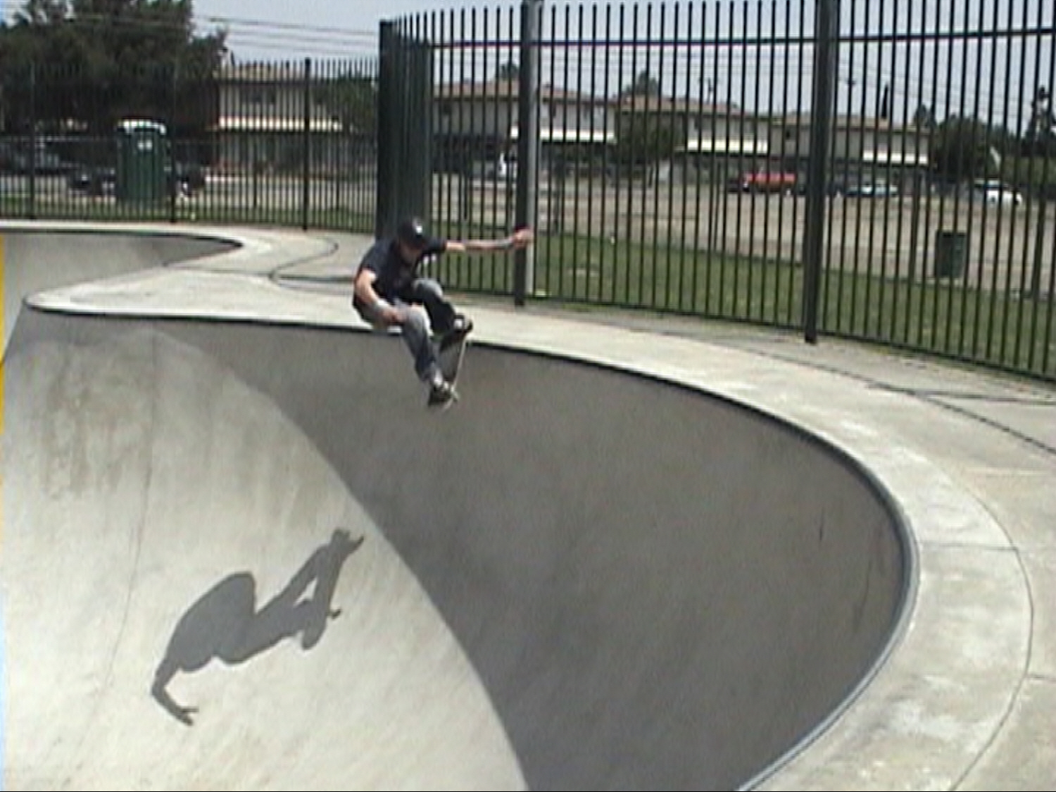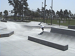 After a cold night in the high desert we awoke early and headed toward the park in Plam Springs. When we got there at 9 in the morning the temp was already hitting the 101 mark. Unfortunately, the park didn't open until 12. What's up with these people? By noon the cement would be hot enough to melt your wheels. A nice hippy lady let us in to walk around and look at the park, and I took some picts and vid. We then hit the road back to LA, with the AC cranked to the max. This lead us next to the Chino skatepark. This is another killer park. A nice street area leading into a cool 5'-6' snake Run/Flow area. There is also a nice clover bowl and a killer clover pool with tile and pool coping. Some dude named Louie was ripping some heavy carve grinds in there. After a good 2 hour sweat session we head onward. Next on the list was Whitter Skatepark. This is a really small park stuck in the corner of a public park. It has a nice little 5' bowl and some really tightly packed street stuff. It would be a good park if you lived around the corner, but there is better stuff. After a short sess, we headed back to Hollywood for another night of food and fun.